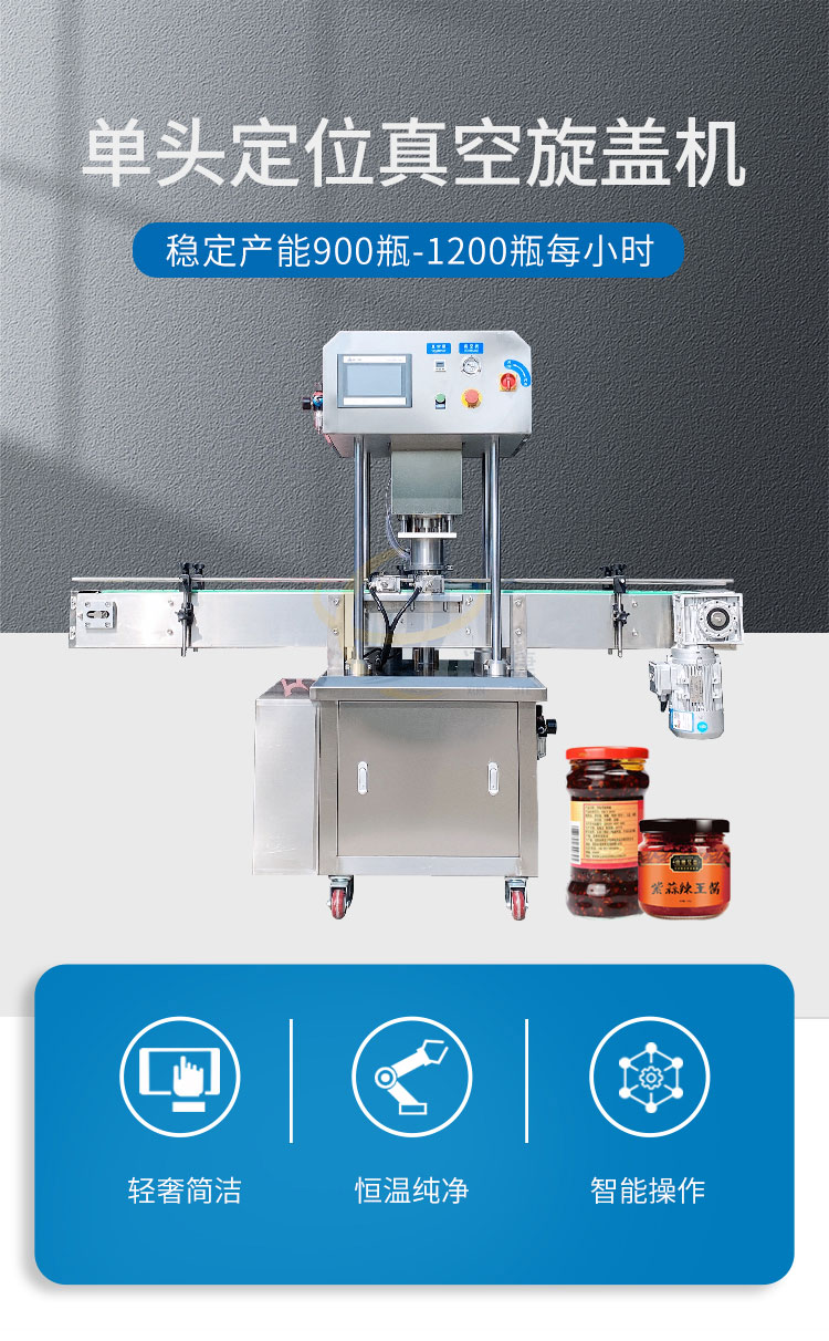 單頭定位真空旋蓋機適用多種瓶型。通過更換模具,即可適合于不同形狀、尺寸瓶子的真空旋蓋,換產(chǎn)方便。